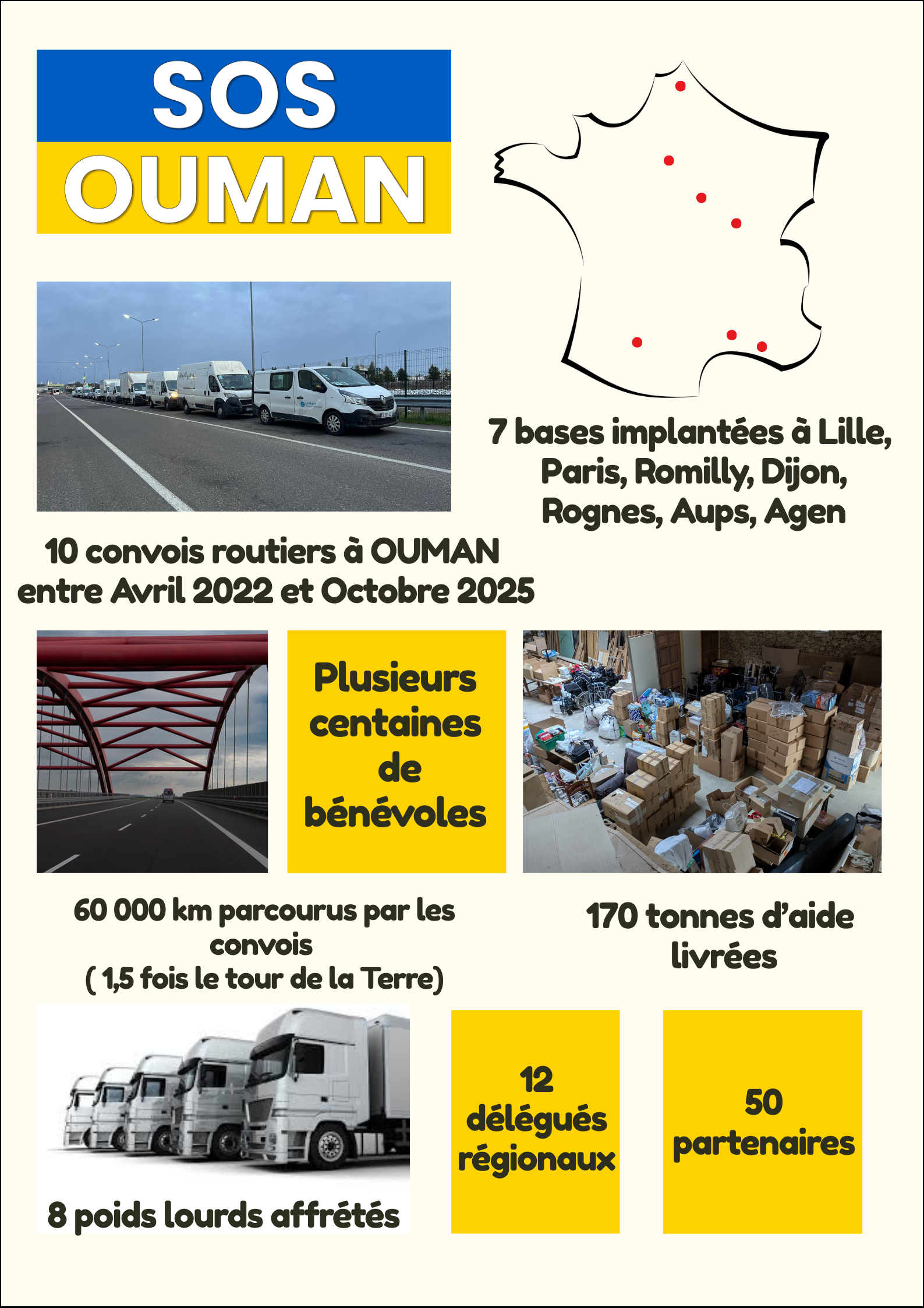 Implantée sur tout le territoire avec 7 bases en France (Agen, Aups, Dijon, Lille, Paris, Rognes et Romilly-sur-Seine), et animée par 12 délégués régionaux, SOS-OUMAN a organisé entre avril 2022 et avril 2025, 9 convois routiers jusqu’à Ouman, et affrété 7 poids lourds. Elle a ainsi acheminé plus de 150 tonnes d’aide humanitaire : matériel médical, médicaments, générateurs, vivres, vêtements chauds et bien plus encore.
