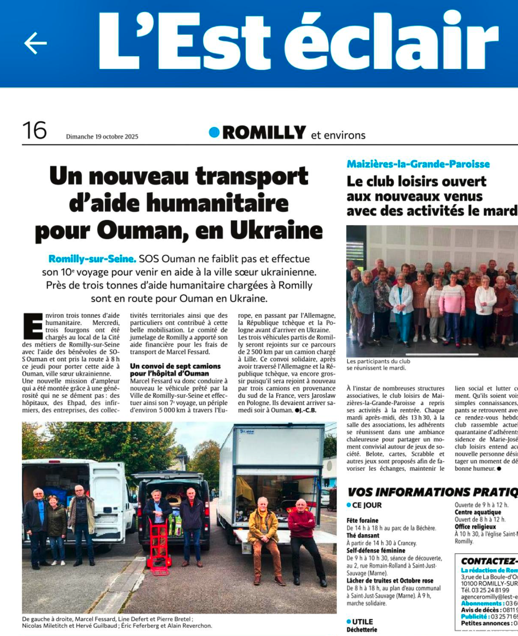 Le 19 octobre 2025, le journal L’Est Éclair a publié un article sur nos bénévoles, partis de Romilly sur-Seine, pour apporter une aide médicale essentielle à Ouman, en Ukraine.
